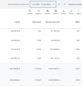 Centralnym elementem działań były kampanie Performance Max, które odpowiadały za generowanie rezerwacji bezpośrednich oraz docieranie do użytkowników na różnych etapach ścieżki zakupowej. Kampanie wykorzystywały pełny ekosystem Google, w tym wyszukiwarkę, YouTube, sieć reklamową oraz Discover. Optymalizacja prowadzona była pod kątem wartości rezerwacji, a nie wyłącznie liczby konwersji.